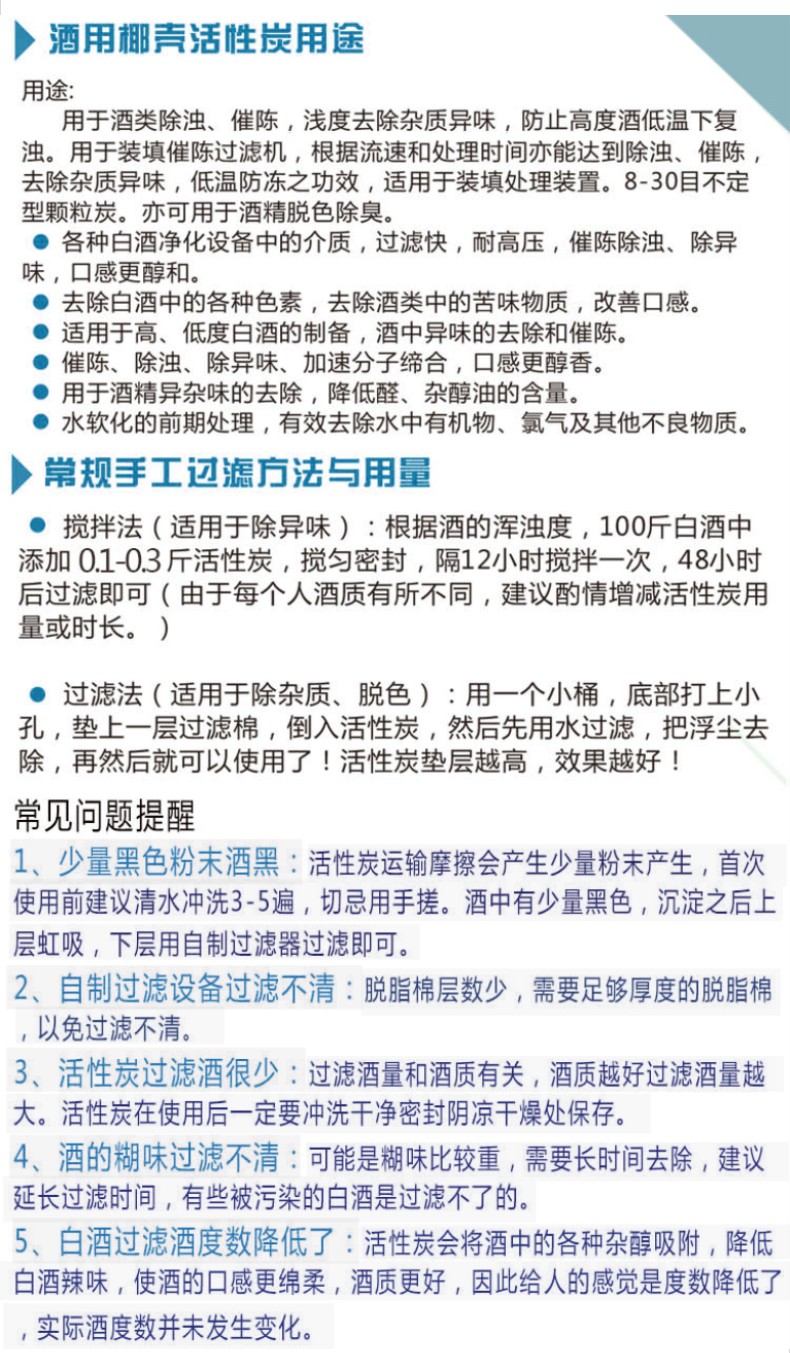 酒用活性炭是疏水性吸附劑,能有效去除引起白酒渾濁的物質(zhì)和異雜味。高度原酒的用量為3‰,低度白酒的用量為1‰;高度原酒作用時間為24h,低度白酒的吸附時間為12h。有關(guān)于酒用活性炭的相關(guān)問題可以隨時聯(lián)系咱們。王經(jīng)理:18638723888,隨時為您解答疑惑。