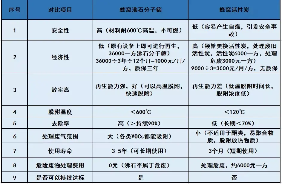 產品根據可有機廢氣成分的不同,配置不同性質及孔徑的分子篩材料,做到針對性、選擇性的處理有機廢氣,滿足設計要求,達到排放標準。
