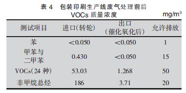由于包裝印刷生產線VOCs 廢氣的質量濃度偏低(<600 mg/m3),需采用沸石轉輪- 催化氧化裝置對廢氣進行濃縮后再作加熱催化氧化處理。6條生產線入口風量Q1=1 5 000 m3/h,每天生產16 h,工作日按330 d/a計算,那么每年排放的VOCs的總量約為:m 總=53.03 mg/m3×15 000 m3/h×5 280 h≈4.2 t/a。經沸石轉輪- 催化氧化裝置處理前后的廢氣VOCs質量濃度見表 4。