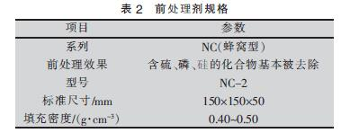 催化氧化分段裝置采用貴金屬Pt 作催化劑,對沸石轉輪處理后的高質量濃度廢氣進行預熱并將其催化氧化分解。其原理在于借助催化劑降低反應活化能, 使得氧化反應發(fā)生在較低的起燃溫度(250~400 ℃)。由于待處理廢氣中可能含有使催化劑中毒的物質(含硫、磷、硅等元素的化合物),因此需在前端設置預處理工序, 即采用陶瓷為載體的前處理劑(見表2)對使催化劑中毒的物質進行攔截。當進入催化劑室的高質量濃度廢氣溫度較低時, 可通過燃燒器對其進行預熱,使溫度上升至350 ℃;由于該溫度為氧化催化劑最佳活性溫度, 此時VOCs 的處理效率可達95%以上。