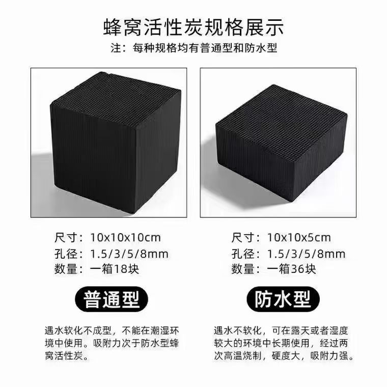 而10cm×10cm×5cm規(guī)格的蜂窩活性炭,每方大概有2000塊蜂窩活性炭