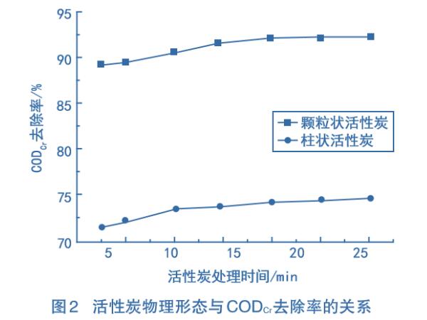 采用椰殼類柱狀活性炭,尺寸為2mm×4mm;顆粒狀活性炭為自制,即將柱狀活性炭用離心碾磨機粉碎,再用篩子篩選出不同粒徑的顆粒狀活性炭。分別在染料廢水中投人顆粒狀活性炭和柱狀活性炭各20g,在常溫條件下吸附,測定不同吸附時間的CODcr去除率,結果如圖2所示。