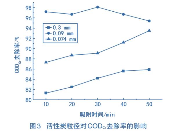采用10g顆粒狀活性炭,粒徑分別為0.3mm、0.09mm、0.074mm的在常溫條件下吸附,測定不同吸附時間的CODcr去除率,結果如圖3所示。